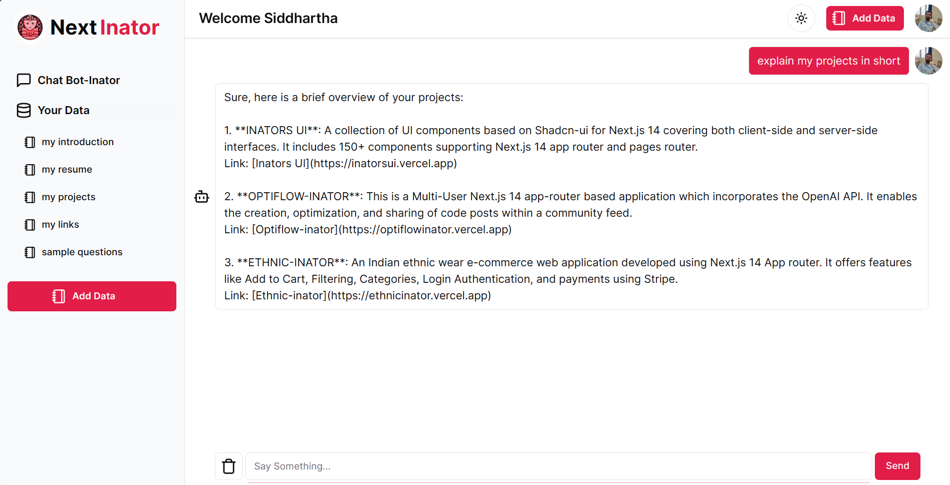 Next Inator is a web app built in Next.js 14, it is an open-ai based custom data based AI chat web-app, powered by open-ai api and pinecone vector database. Users can add their own data, and chat with the data, to get personalized responses. It is a great tool for content creators, marketers, students, and anyone who wants to get personalized responses from ai chatbots.